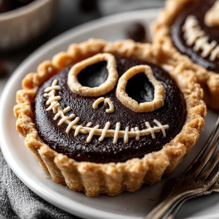 - Pour your chocolate mixture into the chilled crust. Next, roll out the second disk of dough. Using a small knife or cutters, carefully create Jack's face, large oval eyes, tiny nostrils, and a stitched crescent mouth. Lay these pieces out on parchment for easy transfer. For extra richness and shine, paint the face pieces with egg yolk mixed with a drop of black food coloring.