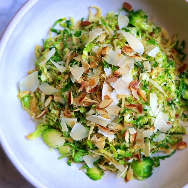 Save Experience a burst of freshness with this Crunchy Lemon Parmesan Brussels Sprouts Salad. Finely shredded Brussels sprouts create a crisp, vibrant base that pairs perfectly with a zesty lemon dressing. Toasted almonds add delightful crunch, while shaved Parmesan delivers a savory depth, making each bite irresistible and balanced.