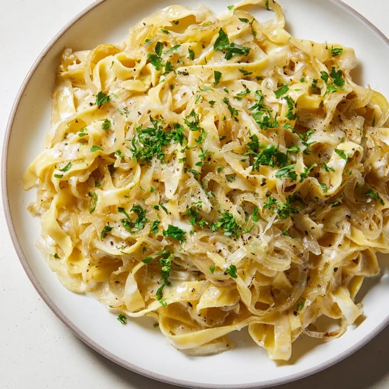 Save There's something about the smell of onions slowly turning golden in butter that makes you slow down and pay attention. I discovered this dish on a quiet weeknight when I wanted the comfort of French onion soup but didn't have the patience for bread and broiler work. Instead, I threw pasta directly into the caramelized onions and broth, and what emerged was something entirely its own—creamy, savory, and ready in under an hour. It became my go-to when I needed something that felt fancy but asked almost nothing of me.