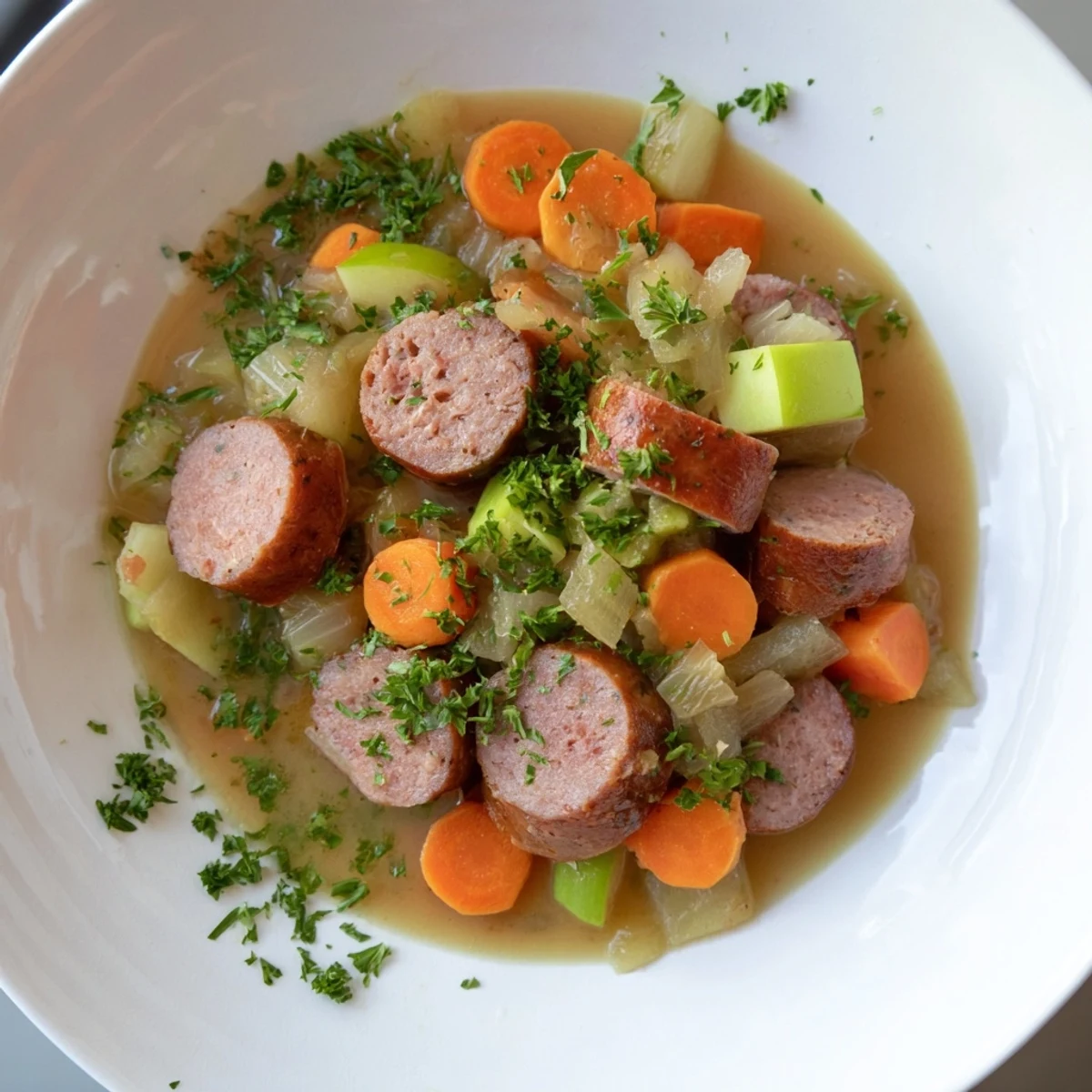 Save A hearty, budget-friendly hotpot featuring savory sausage, tender celery, and sweet apples, all simmered together for a comforting one-pot meal.