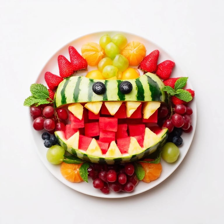 Slice one end of the watermelon at an angle to form the mouth opening, scoop out the flesh for filling, and carve jagged teeth along the edge. Add details like eyes with blueberries and apple or banana slices.
