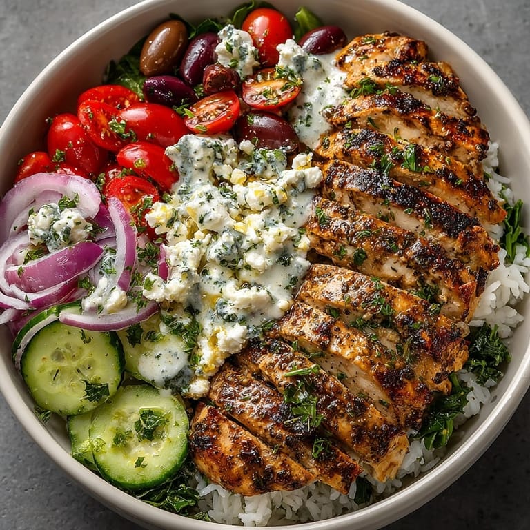 This Greek chicken bowl blends grilled chicken with fluffy rice, cherry tomatoes, cucumbers, and Kalamata olives, topped with a creamy lemon tahini dressing. Each bowl is loaded with Mediterranean flavors and freshness from herbs and tangy feta. Meal prep is simple, letting you enjoy satisfying, gluten-free lunches all week. Customize with different grains or extra veggies to suit your taste or dietary needs, and garnish with parsley for extra color and aroma.