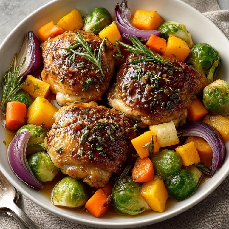 Enjoy succulent chicken thighs coated in a rich honey garlic glaze, nestled among roasted butternut squash, Brussels sprouts, carrots, and red onion. This one-pan dish brings together autumn's best vegetables with a simple, flavorful sauce for effortless weeknight dining. Minimal prep, easy cleanup, and comforting flavors make it perfect for cozy evenings or sharing with family. The blend of savory aromatics, sweet honey, and a touch of mustard delivers a delicious main course that's hearty and naturally gluten-free.