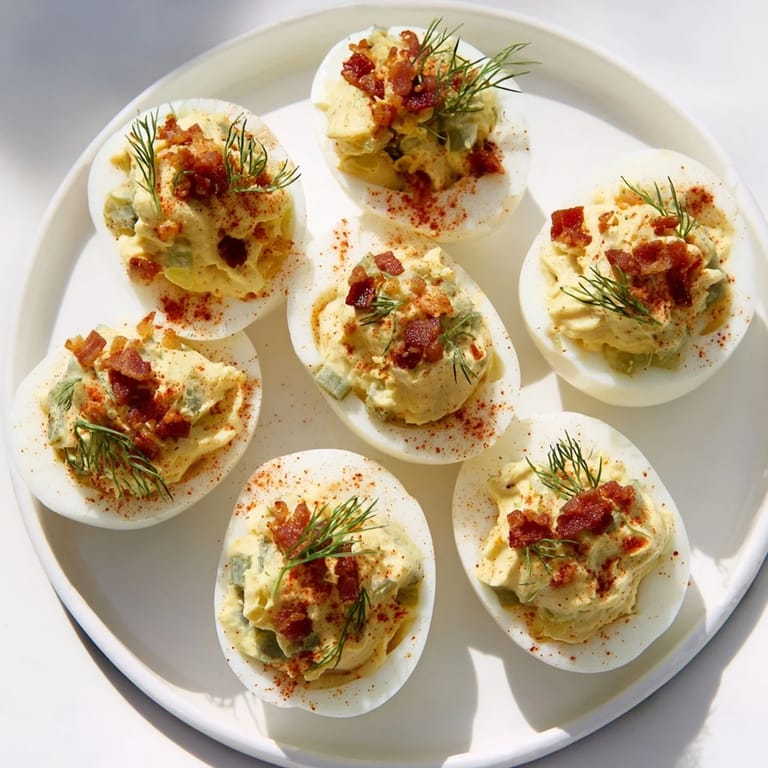 These loaded deviled eggs combine creamy mashed yolks with crispy bacon, tangy pickles, fresh dill, and chives. Smoked paprika adds a subtle smoky note that complements the rich flavors. Quickly prepared by boiling eggs, mixing the filling, and garnishing, they are ideal for parties or casual snacks. Optional toppings and a vegetarian alternative make this a versatile dish to enjoy with sparkling beverages.