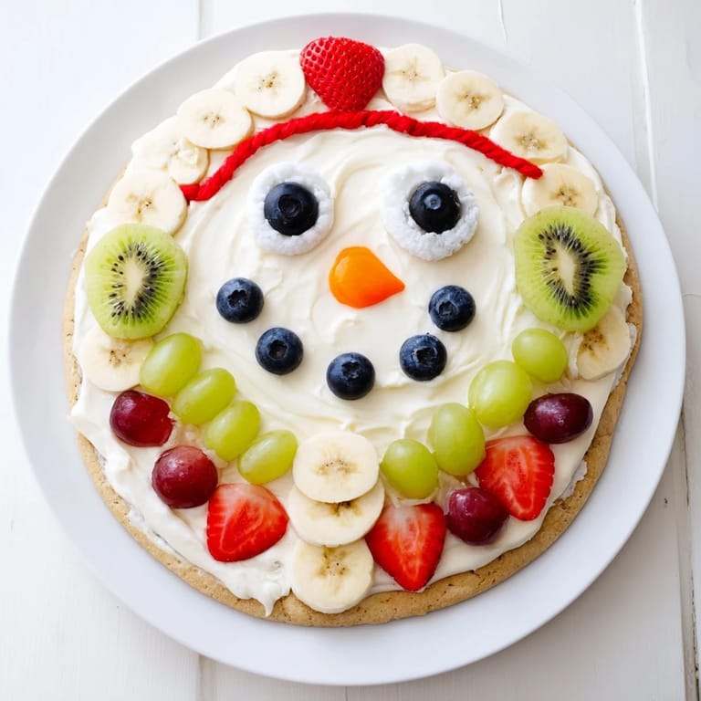 This playful dessert starts with a sugar cookie crust baked to golden perfection. A smooth cream cheese frosting is spread atop the cooled crust, creating a creamy base. Fresh fruit such as banana slices, blueberries, strawberries, and grapes are artfully arranged with marshmallows and candy to resemble melting snowmen. The combination offers a sweet, creamy, and fruity experience perfect for winter festivities and family fun.