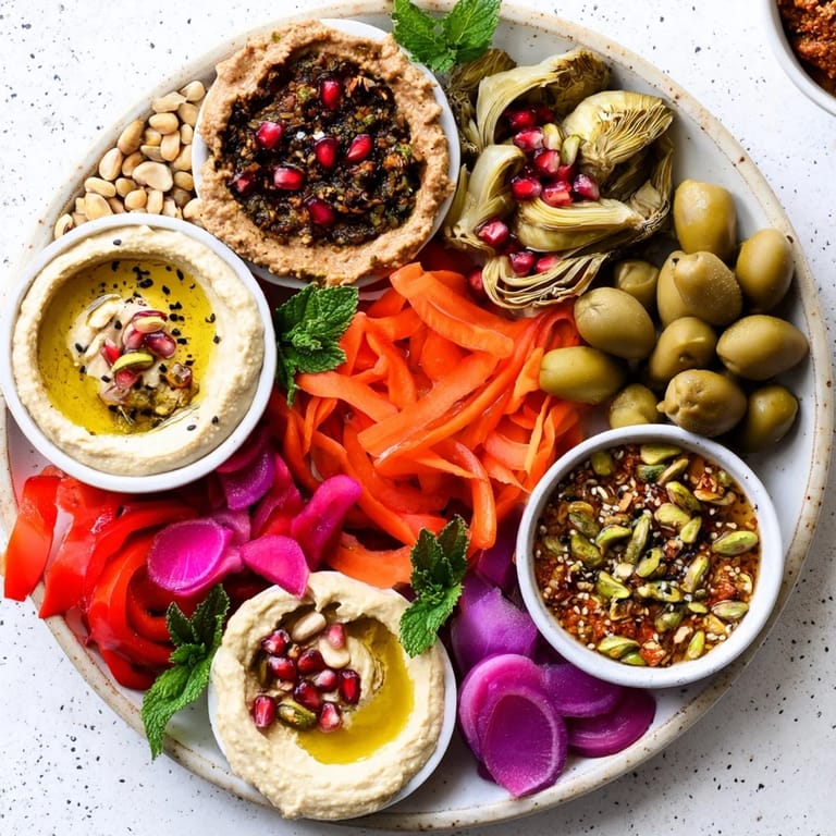 This vibrant Moroccan tile mosaic platter combines an array of flavorful dips like hummus, baba ganoush, and muhammara with marinated vegetables, olives, and nuts arranged in small colorful bowls. Fresh herbs, pomegranate seeds, and a drizzle of olive oil finish the platter, creating a visually stunning and shareable centerpiece. Served with toasted breads or gluten-free crackers, this medium-difficulty mezze offers layers of Mediterranean flavors perfect for guests to enjoy and mix.
