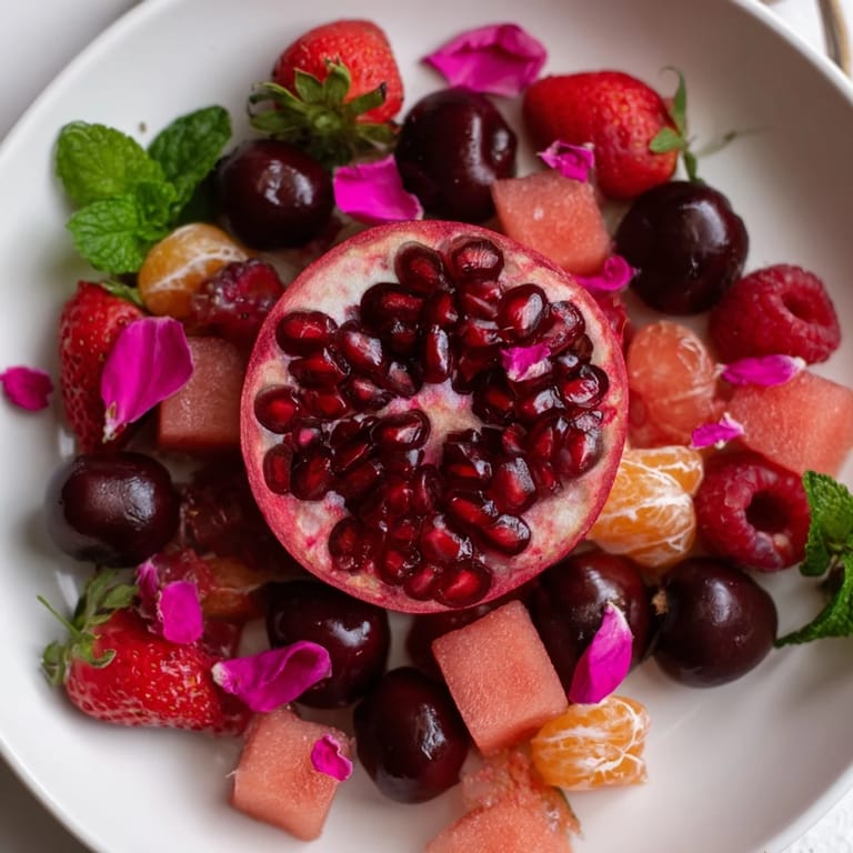 - Scatter fresh mint leaves and rose petals if you're using them, letting them settle into small crevices rather than looking too placed. Serve immediately while everything is at its crispest, or cover loosely with plastic wrap and chill until guests arrive—never more than a few hours, or the cut fruits start to weep.