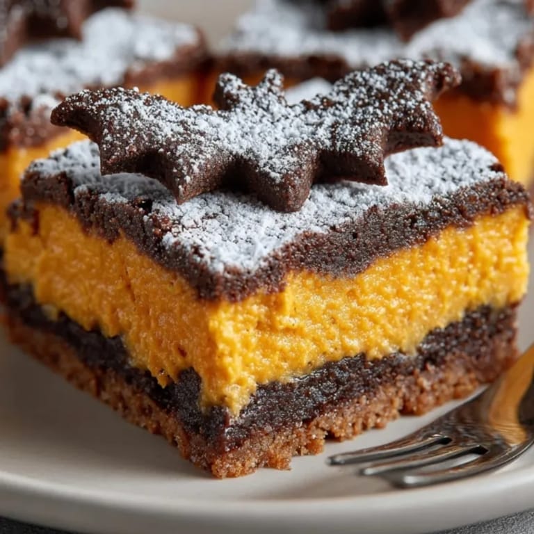 Pumpkin pie has deep roots in American harvest tradition and the chocolate crust pays homage to classic sandwich cookies often enjoyed in the fall Bat shapes transform these bars into a true Halloween treat a nod to the playful side of autumn baking Pumpkin filling itself traces back to colonial recipes where vegetables replaced expensive ingredients for creamy pies