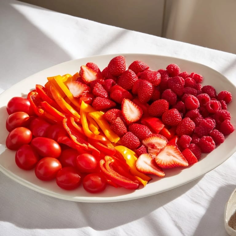 • Red section (cherry tomatoes, strawberries, red bell peppers, raspberries): This is your sweetness and brightness anchor. The tomatoes bring umami earthiness while the berries add tartness—they're what make people pause mid-bite and say, 'Oh, these taste so good together.'