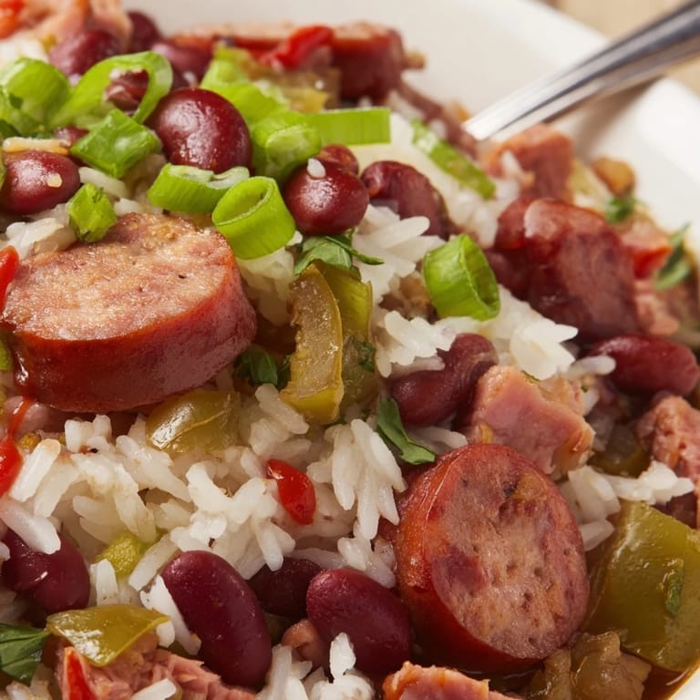 Save A classic Creole dish featuring tender red beans simmered with smoky sausage and aromatic vegetables, served over fluffy white rice. Hearty, flavorful, and perfect for a comforting meal.