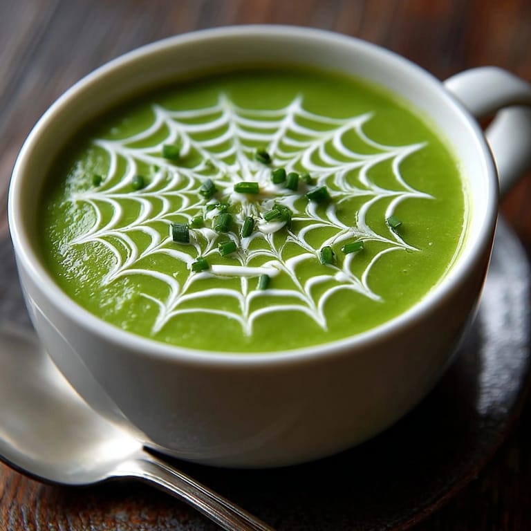 This split pea soup boasts a creamy, comforting base made from slow-simmered split peas and fresh vegetables. Onions, carrots, and celery add depth, while smoked paprika and thyme provide aromatic warmth. A whimsical touch of piped sour cream creates a playful spiderweb pattern on top—perfect for festive autumn tables. Serve warm, garnished with fresh herbs for a lively finish. Pair with rustic bread for a satisfying meal that’s both nourishing and visually delightful. Simple substitutions offer vegan and spicy variations, accommodating a range of dietary needs.