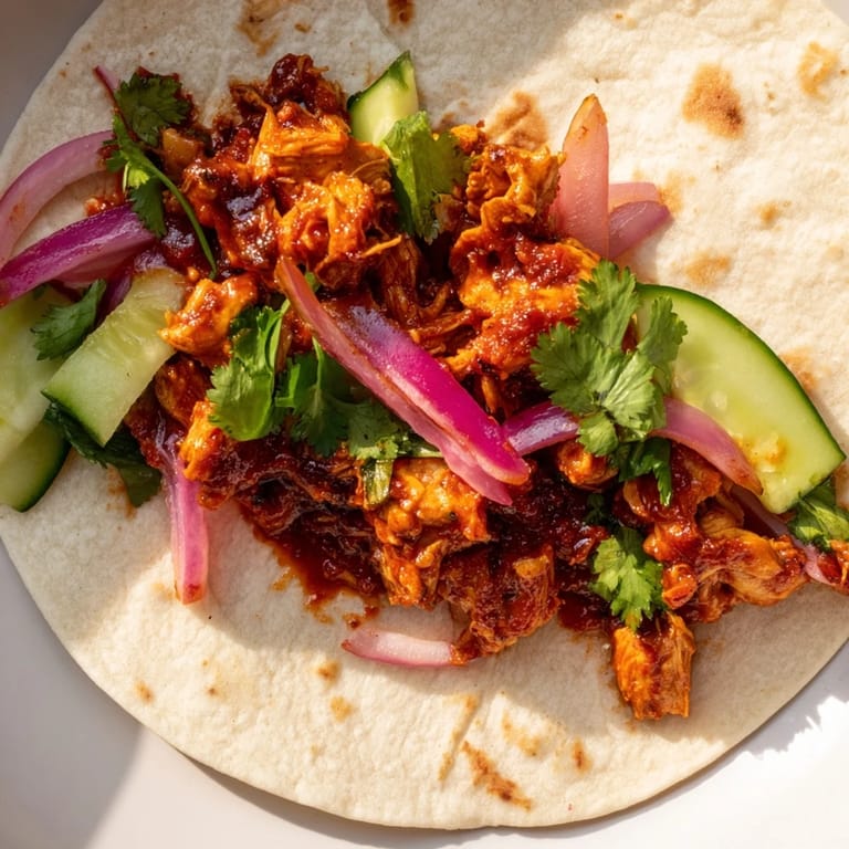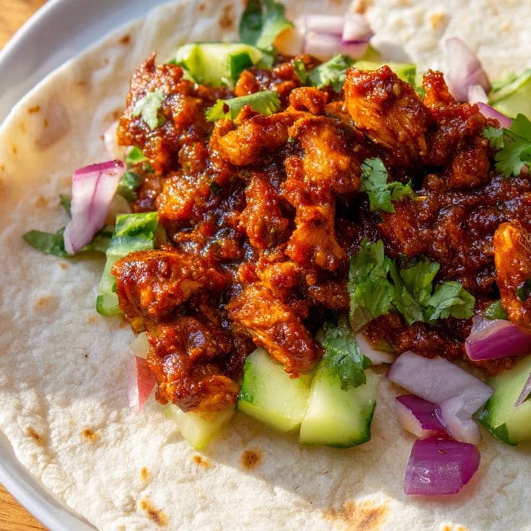 Save A fusion of Indian and Mexican favorites: tender slow-cooked chicken tikka masala wrapped in soft taco shells, finished with a sticky, flavorful glaze and fresh toppings.