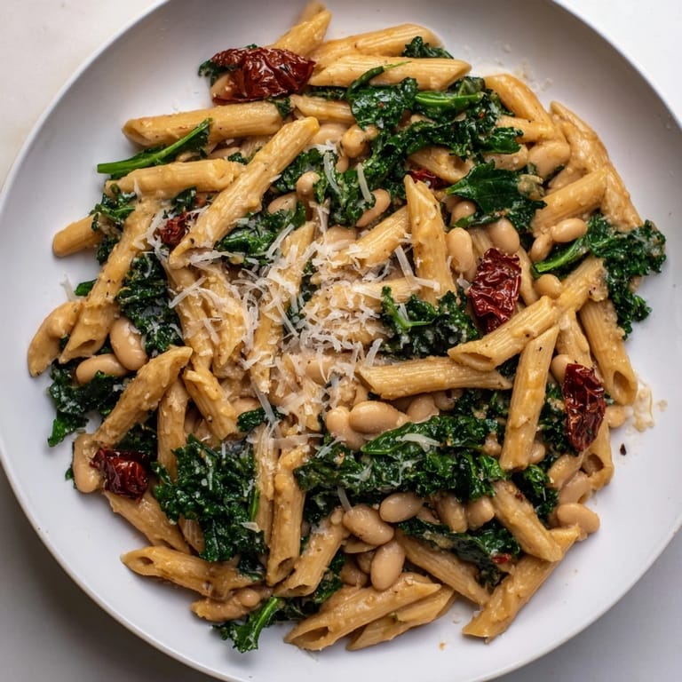 Save A festive, wholesome pasta dish featuring creamy white beans, hearty kale, and aromatic herbs—perfect for a nourishing holiday meal.